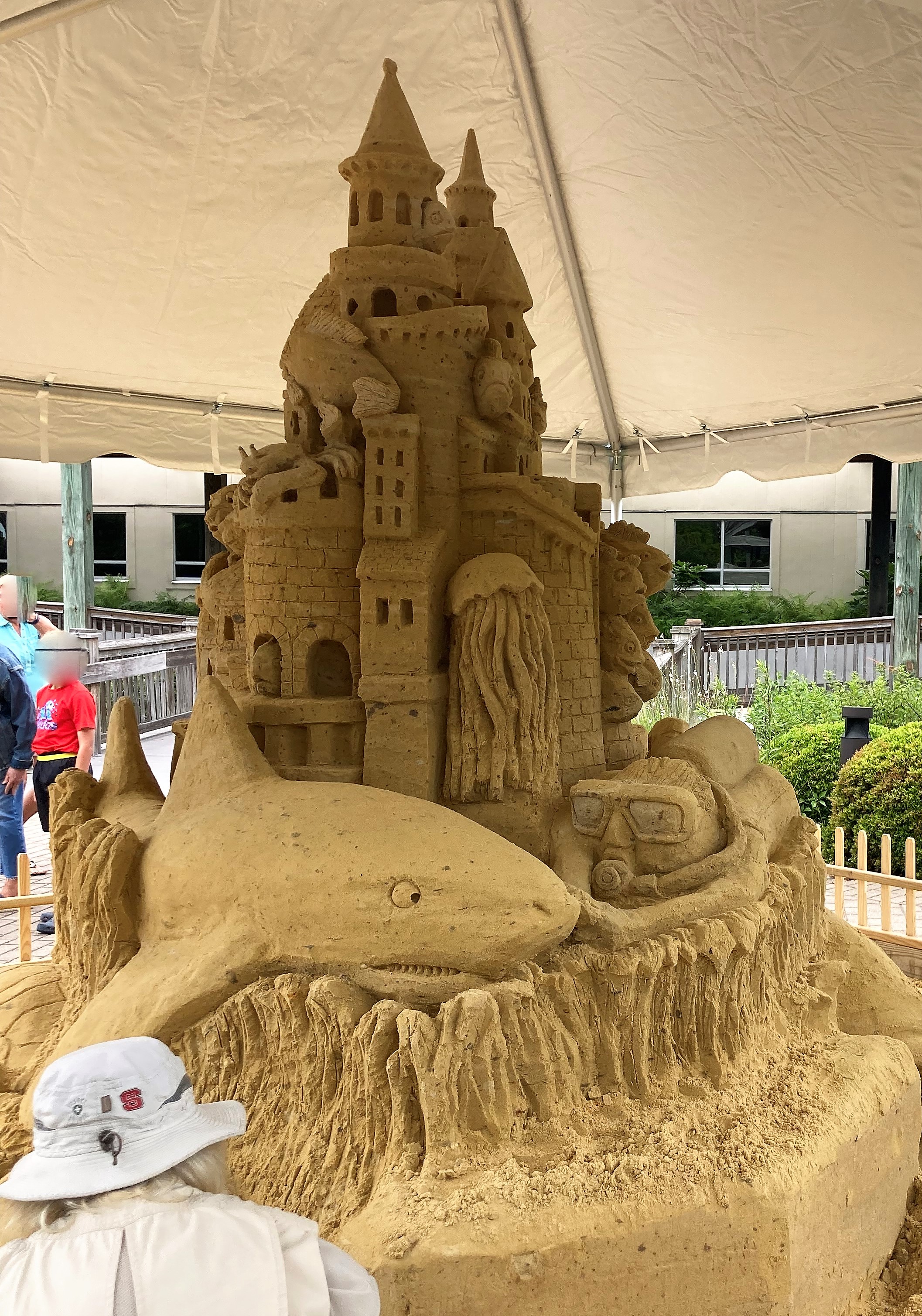 A team of carvers created a nine foot tall sand castle in front of the NC Aquarium at Pine Knoll Shores, with an octopus, a shark, a school of three dimensional fish, and dry waves crashing around its base.